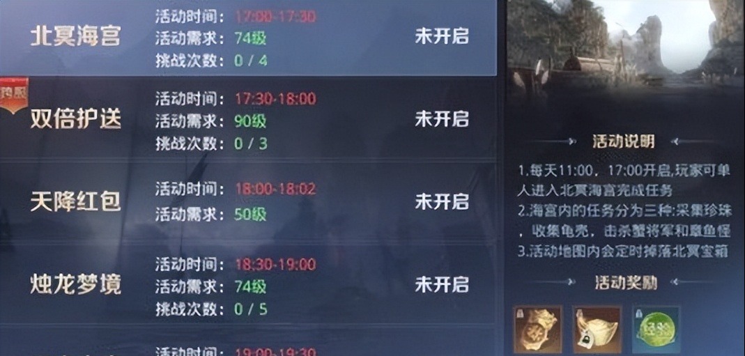 开服首日的定时活动,在74级开启的烛龙梦境和北冥海宫活动,能获得较多的经验收益。活动在一天中分为两个时间段开启,不要错过了哦,错过了的话就要等第二天啦。参与该活动的等级越高获得的经验收益越高,建议可以留在下午的时间段参与活动。