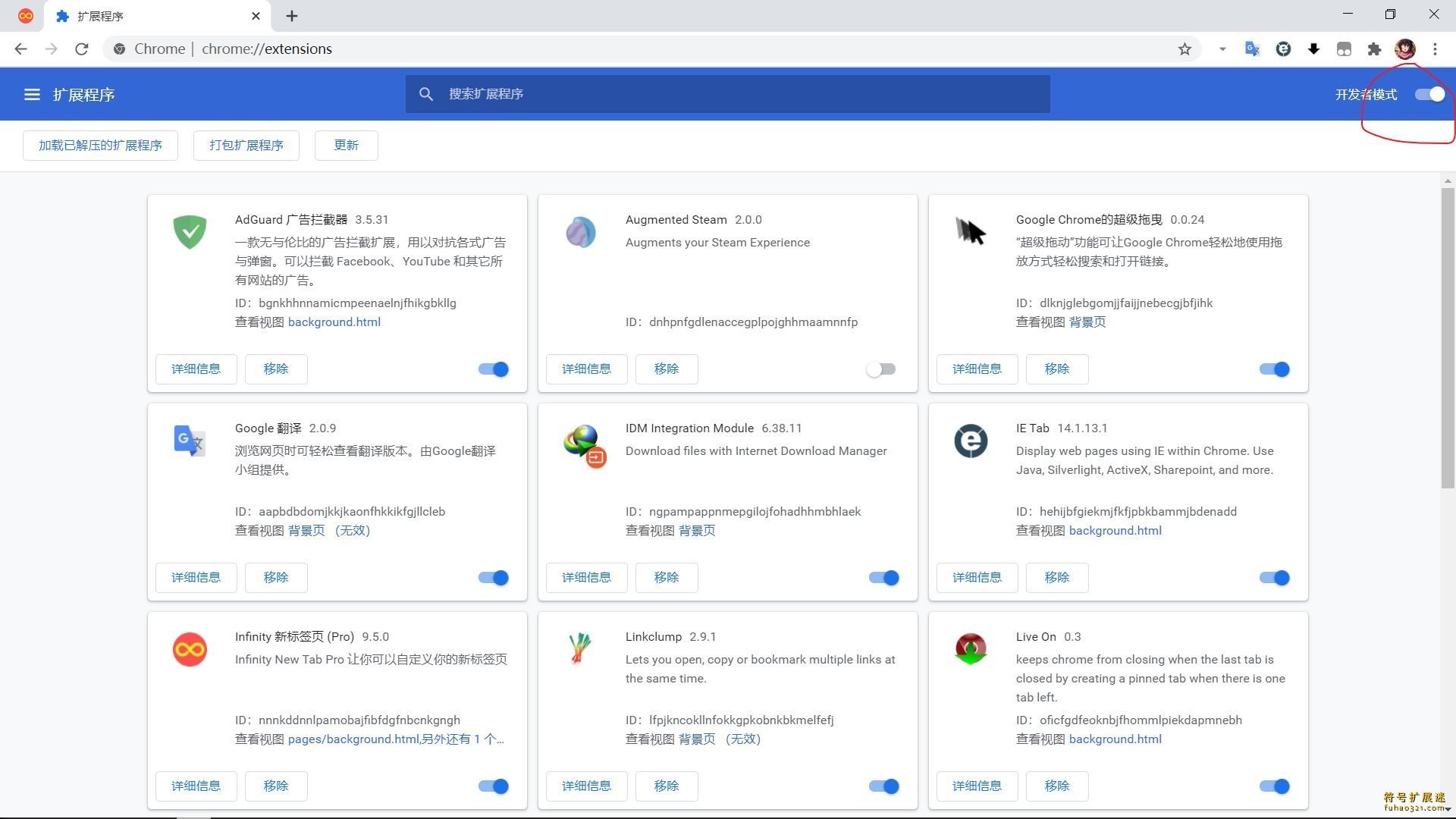 4、在Chrome浏览器中,点击菜单的三个点,选择[扩展管理],或直接输入地址[chrome://extensions/],激活[开发者模式]