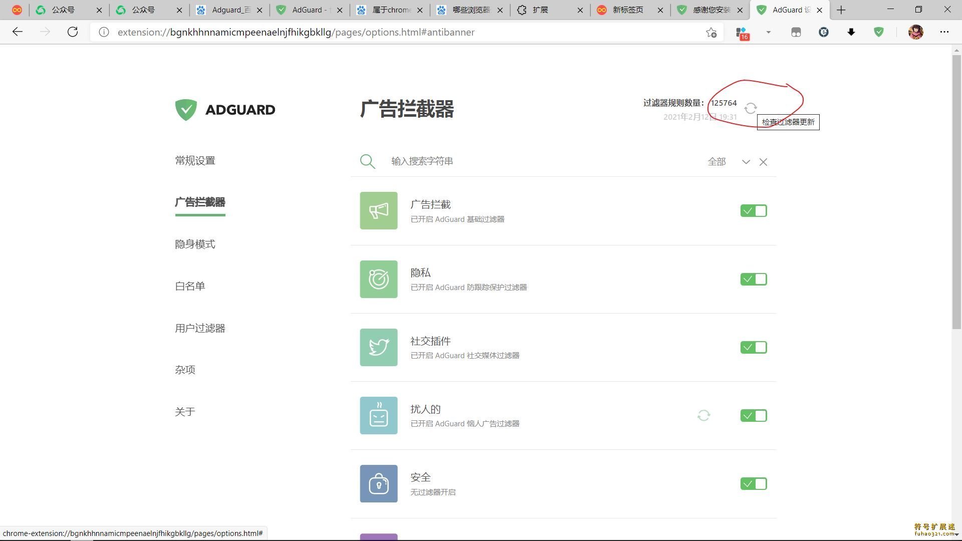 ● 把广告拦截器页面所有的选项全部打开,然后更新过滤器