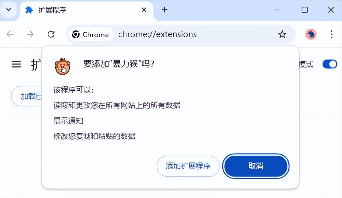 5、将下载的.crx文件拖入浏览器窗口中,点击[添加扩展程序]来完成安装