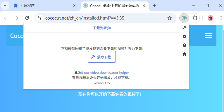 6、安装后,访问需要下载内容的网站,点击浏览器右上角的CocoCut图标,选择相应的下载选项