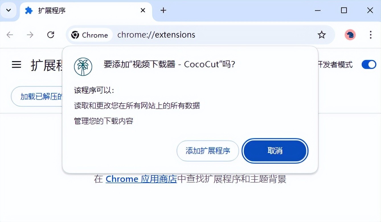 5、将下载的.crx文件拖放至扩展程序页面,选择[添加扩展程序]以完成安装