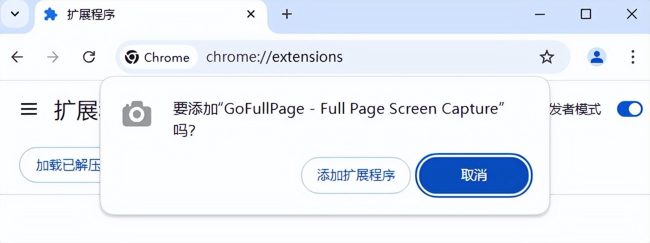 4、将下载的.crx文件拖拽至扩展程序页面,点击[添加扩展程序]完成安装