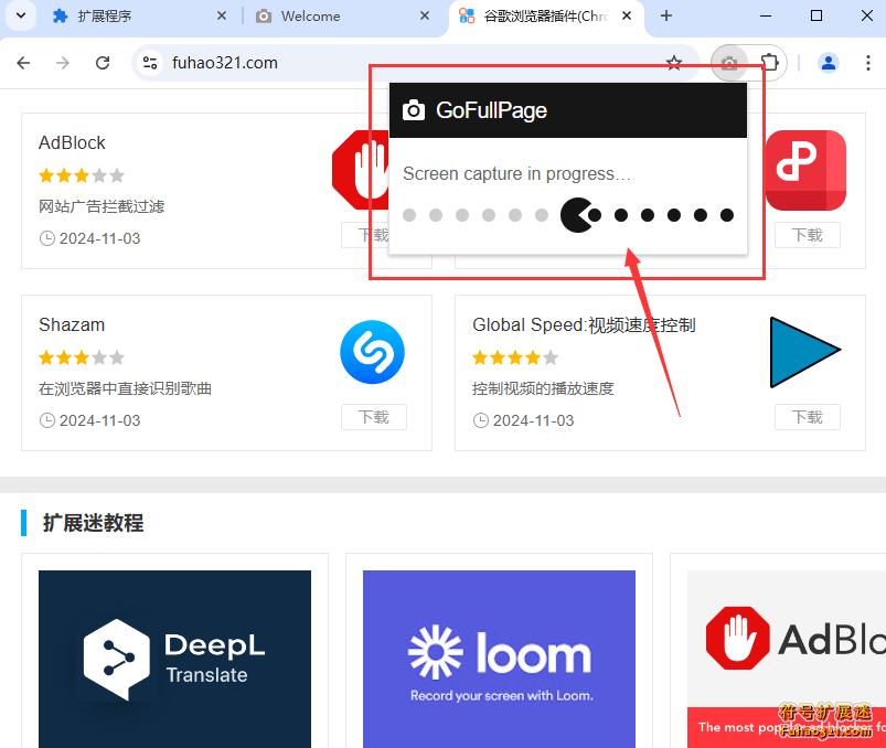 使用非常方便,打开你需要全部截图的网页,然后点击这个插件按钮,即可看到自动会滚动到网页最底部,上面还有进度