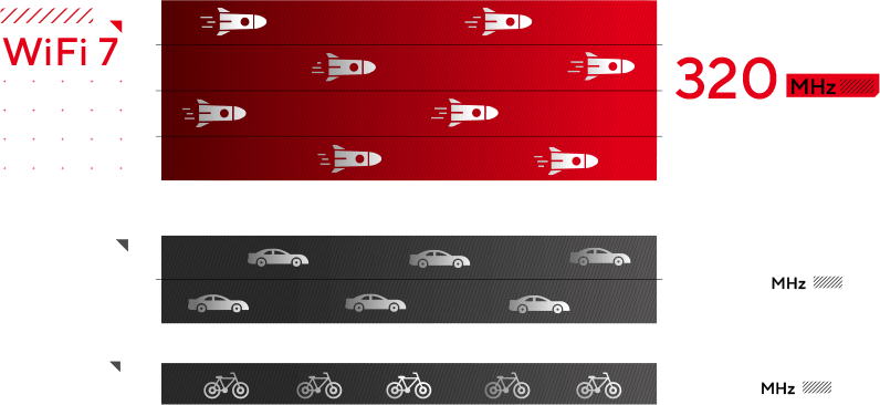 WiFi 6E 将 6 GHz 频段的频宽增加至 160 MHz,而 WiFi 7 将带宽推至超宽 320 MHz 大频宽,使数据传输容量翻倍。您可以将网络当作虚拟高速公路,将双倍带宽当作宽度加倍的车道。现在,装载更多数据的大型车辆可以在高速公路上行驶。