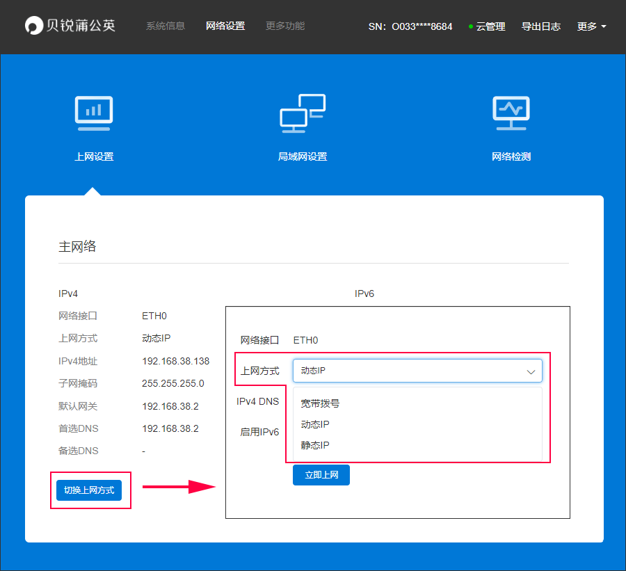 主网络切换上网方式,可选择带宽拨号/动态IP/静态IP上网方式。