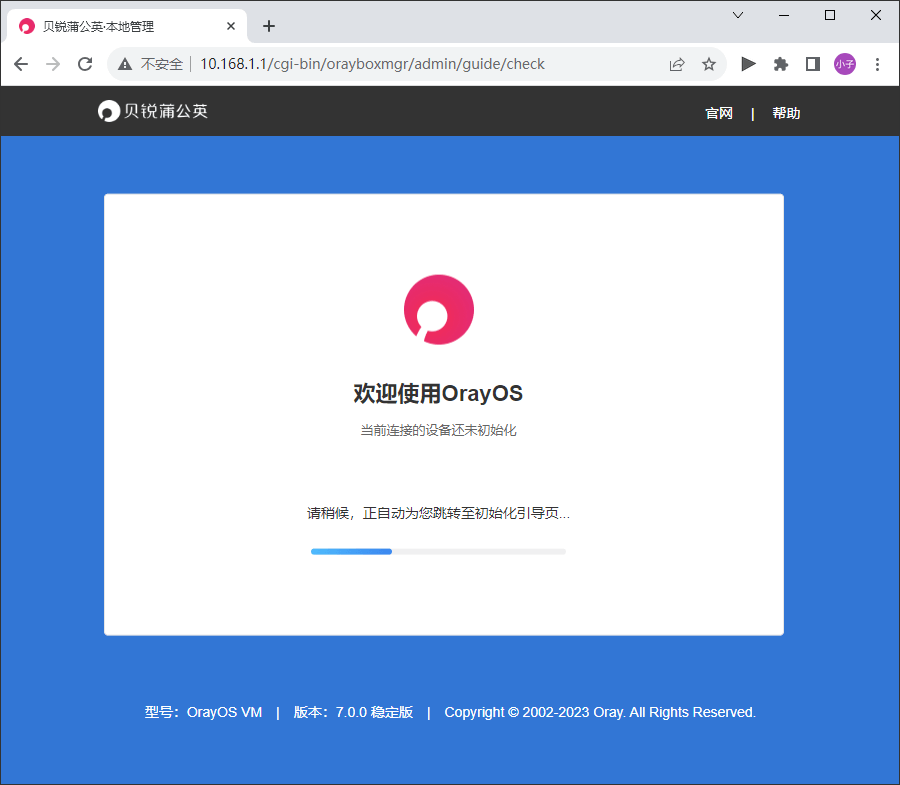 系统安装完成并接入网络后,在浏览器输入OrayOS默认管理IP地址:10.168.1.1,跳转本地管理初始化页面进行配置使用。