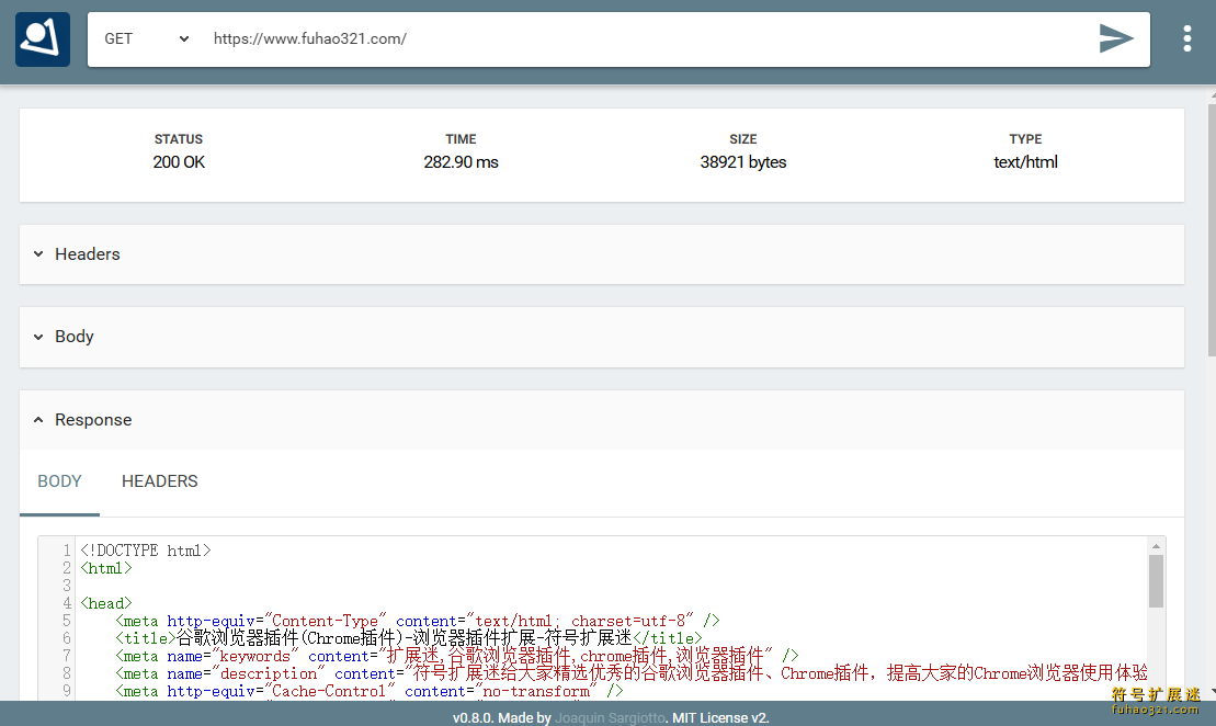 全部准备好之后,可以直接点发送按钮,或者使用快捷键 Ctrl+Enter。插件会立刻执行请求,返回的结果会在下方显示出来。