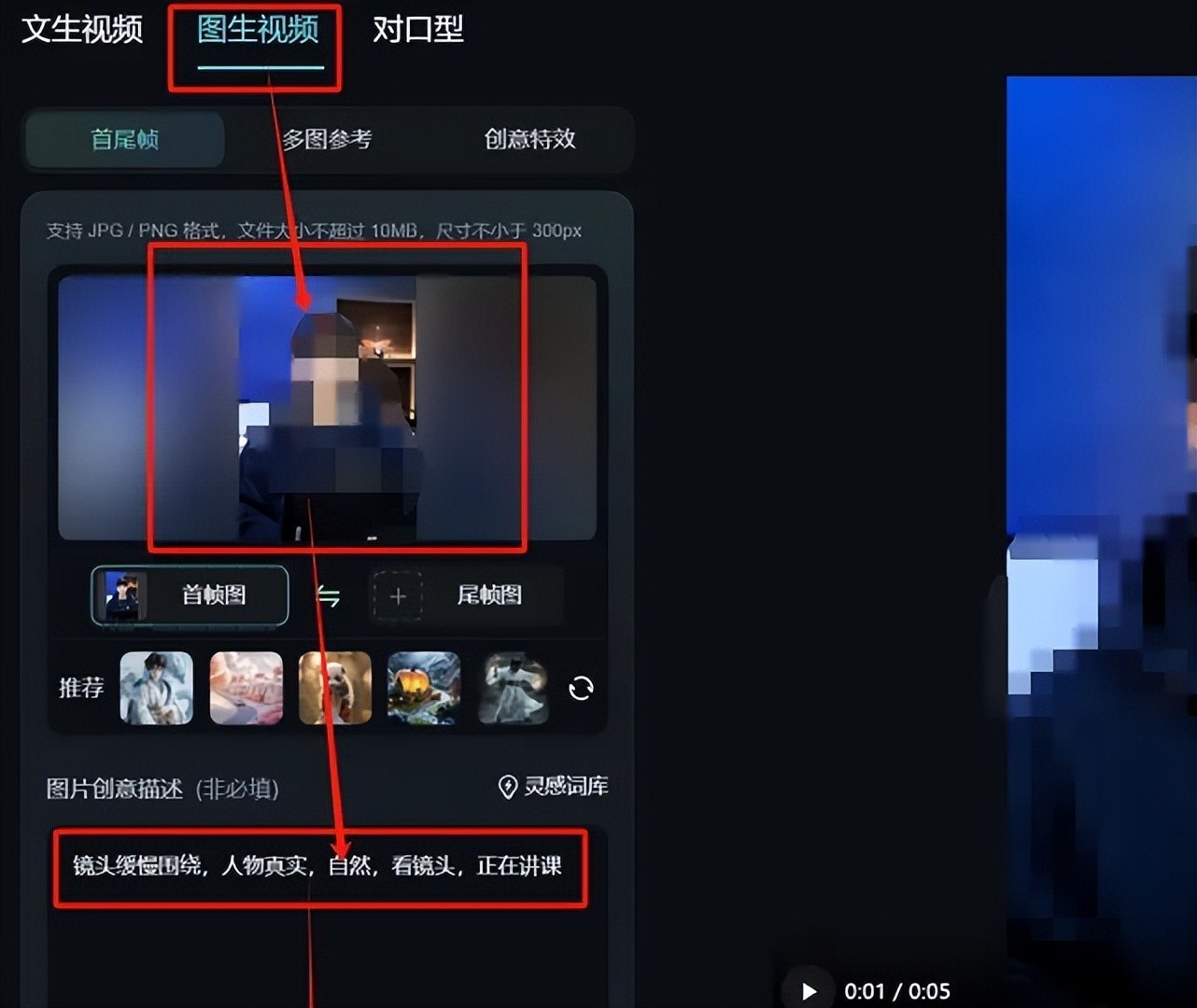 然后你只需要上传一张照片到可灵 AI,设置一些简单的描述,就能生成数字人视频了。