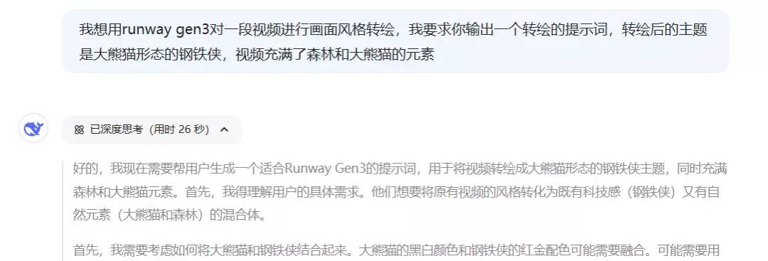 Deepseek 的优势在于,它能自动生成符合风格的提示词,你不需要再去查找和学习转绘的技巧,直接使用它提供的内容,就能得到满意的视频效果。