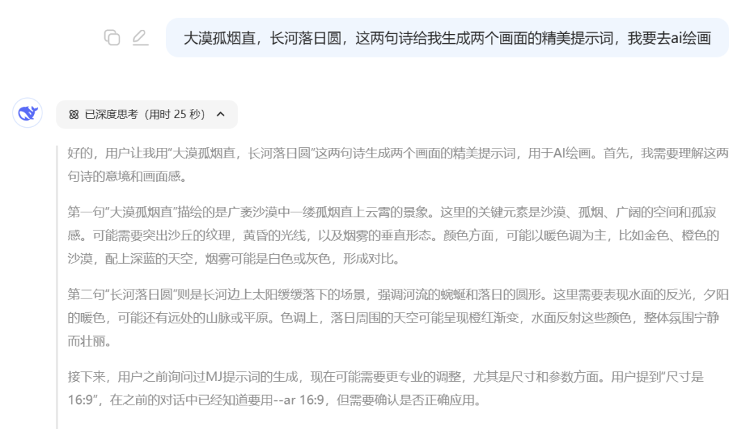 Deepseek 经过思考就会生成符合诗句意境的提示词,