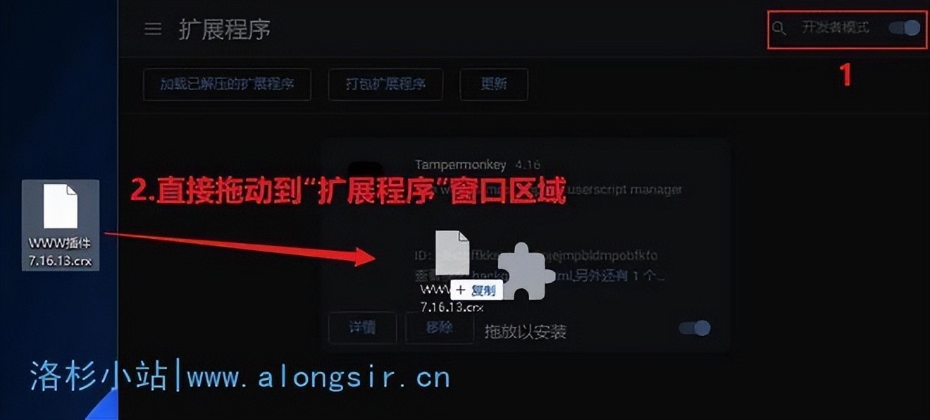 △step3:直接拖拽crx格式插件到”扩展程序”窗口区域,松开鼠标(因为我油猴插件已经安装,这里我用其他插件演示的。)