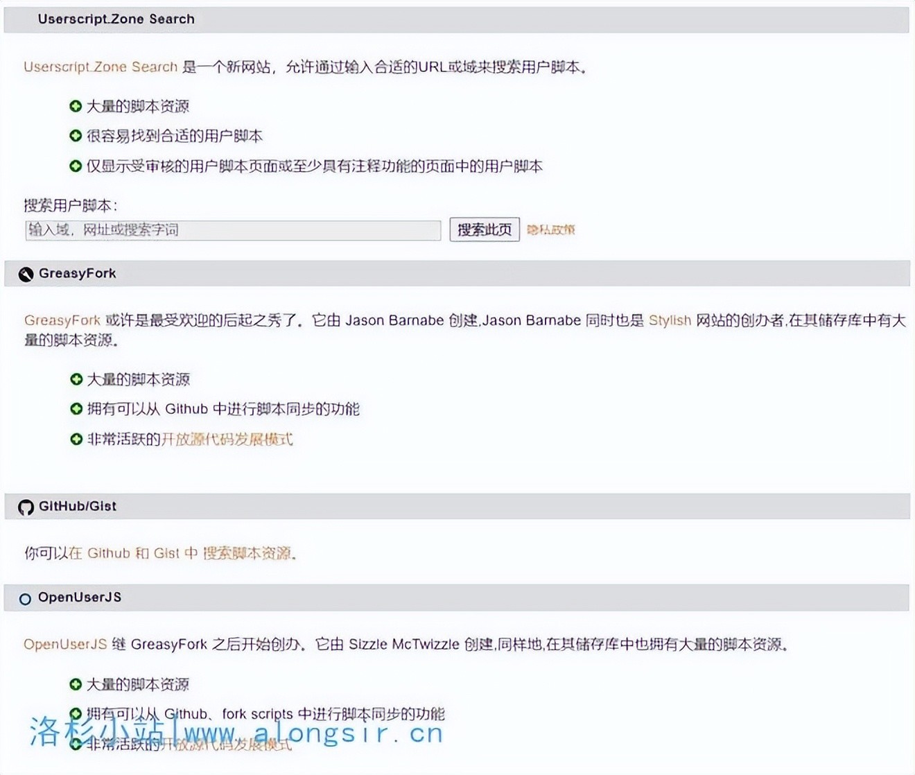 TamperMonkey油猴脚本插件,是一个脚本管理器,其自身并不提供脚本,所以我们需要额外的安装脚本。点击油猴脚本插件的弹窗菜单(上图中有)中的”获取新脚本”,会浏览器标签页会跳转到TamperMonkey油猴脚本插件的官网,在网站”用户脚本”标签页下,可以看到四种获取脚本的方式。