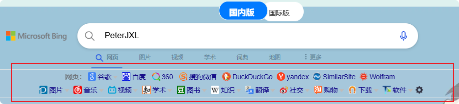 该脚本在搜索框下方添加了一排搜索引擎工具条,并进行了分类,比如网页、翻译、知识、视频、学术、下载等等。