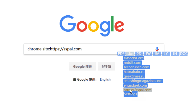 为 Google 搜索页面添加更多功能按钮,提供了按照最后天数 / 周的时间格式搜索、PDF/DOC 搜索等,用户还可以设定 site: 自动填充限定在哪个网站域名下搜索资源。
