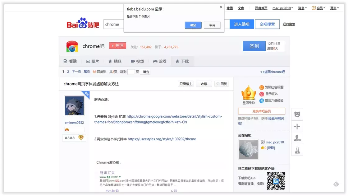 进入帖子页面,新增提供了下载按钮在分类栏里,实现一键批量下载贴吧中一页的原图(提示检测到即将下载的图片数量)。