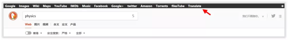为专业搜索引擎 DuckDuckGo 添加功能条,帮助用户一键跳转到 Google、Facebook、YouTube 等站点进行搜索。