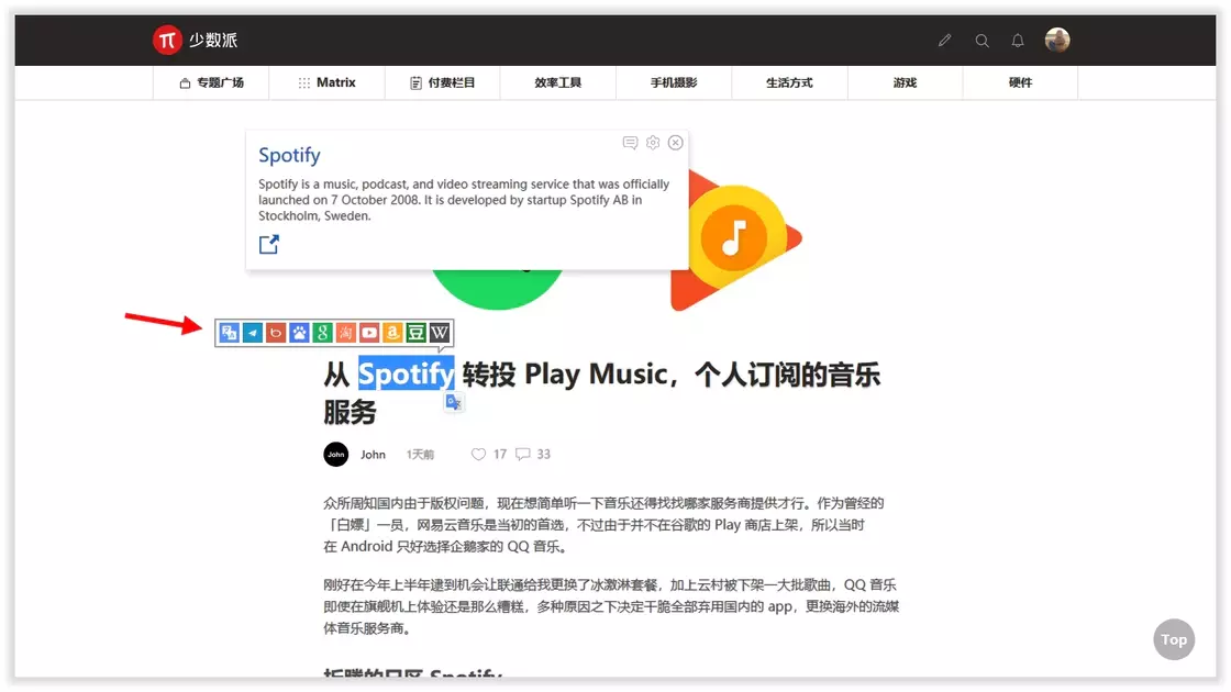 在选中的文字上弹出搜索/翻译等快捷操作按钮,支持多个搜索引擎、维基百科等站点快速查询,对于碰到陌生的英文、专业术语类实现快捷搜索的目的。