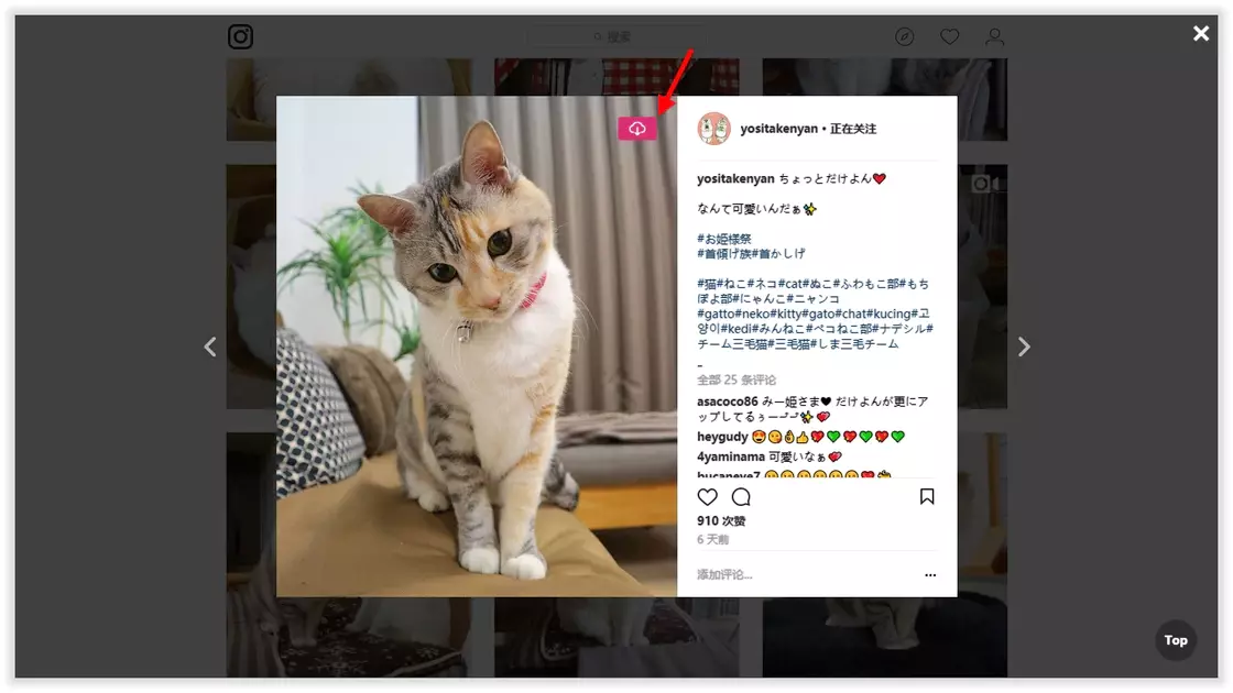 方便用户下载 Instagram 的图片和视频,将鼠标移动到图片或者视频上,即可看到下载按钮,官方也有提供 Chrome、Firefox 扩展版本。