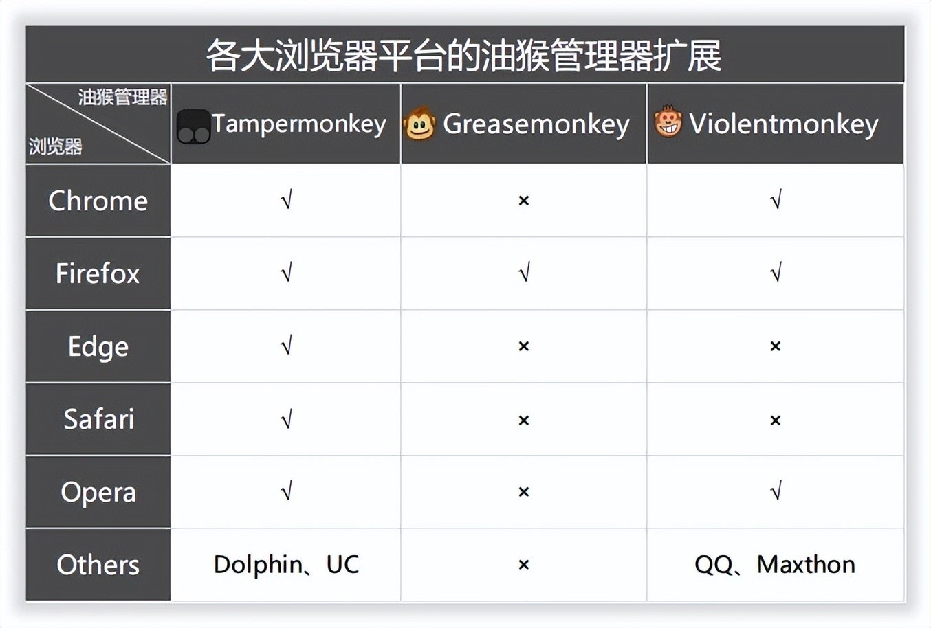 油猴管理器作为浏览器扩展中的神器之一,目前有 Tampermonkey、Greasemonkey、Violentmonkey 三大油猴管理器,它们对于各大浏览器平台的支持情况: