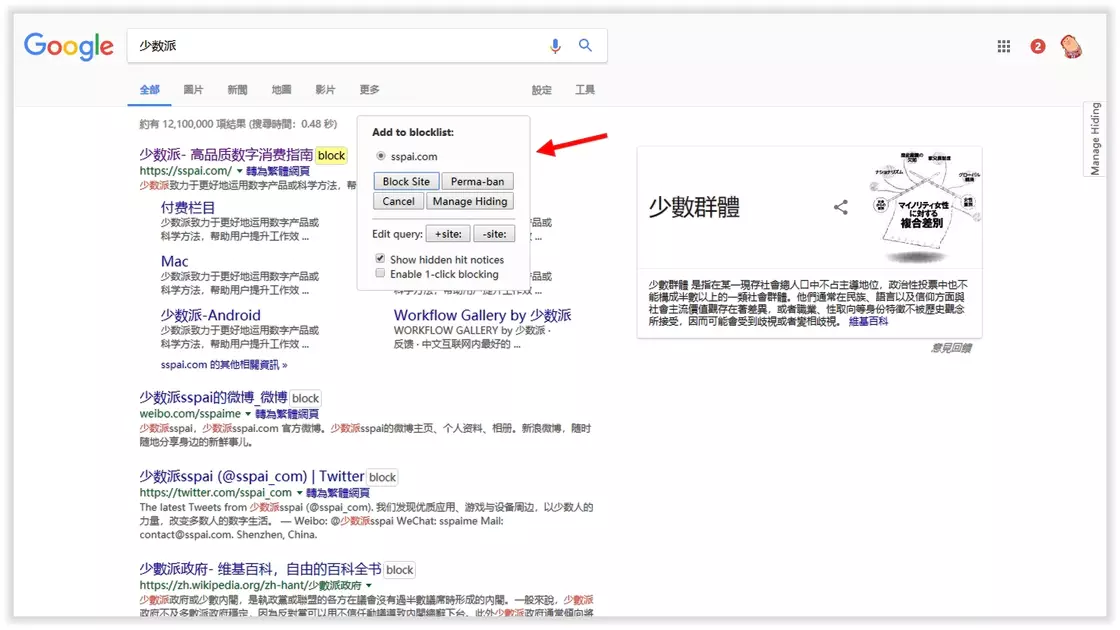 过滤搜索结果不需要的域名:Google Hit Hider by Domain