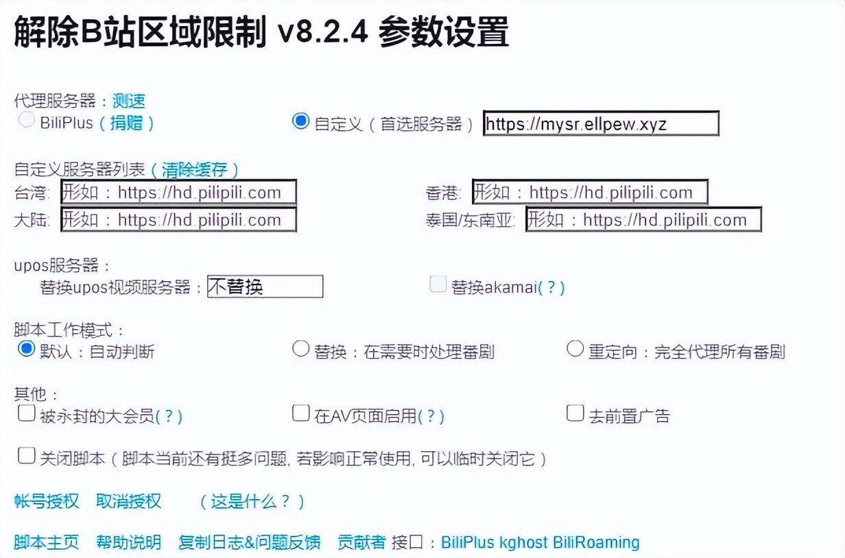 先右侧点击设置输入代理服务器,地址来自https://github.com/yujincheng08/BiliRoaming/wiki/%E5%85%AC%E5%85%B1%E8%A7%A3%E6%9E%90%E6%9C%8D%E5%8A%A1%E5%99%A8