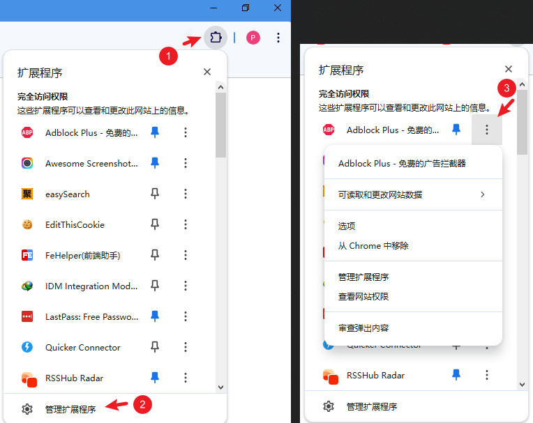 或者点击扩展管理图标,也能看到已安装的插件,并可以点击插件右侧的 ⁝ 对插件进行管理: