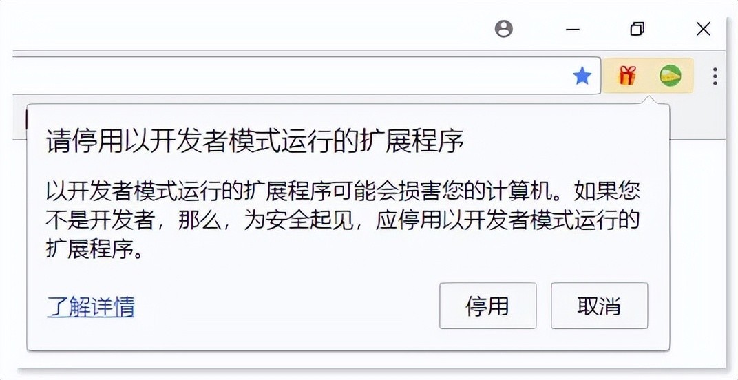离线安装扩展后,可能会遇到每次启动 Chrome 时,浏览器右上角会弹出「请停用以开发者模式运行的扩展程序」: