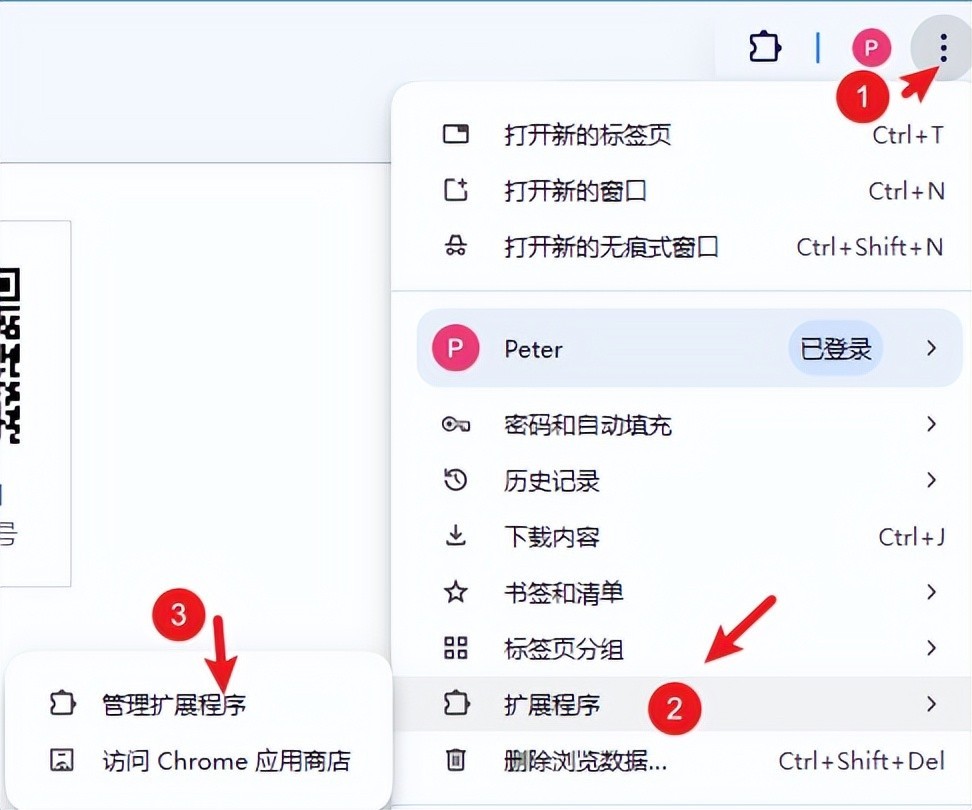 还可以在地址栏输入 chrome://extensions/ 进入扩展程序界面。