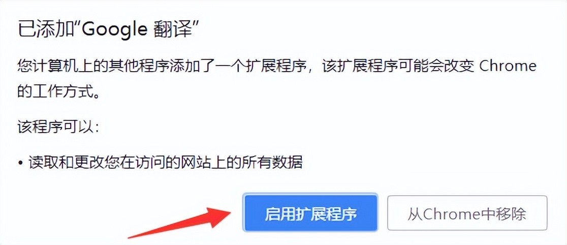 或者打开 Chrome 后等几分钟,浏览器会弹出是否启用扩展程序的对话框,点击启用即可: