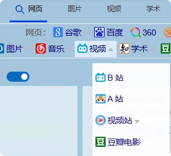把鼠标放到某个分类下,会出现一个下拉列表,显示更多搜索引擎: