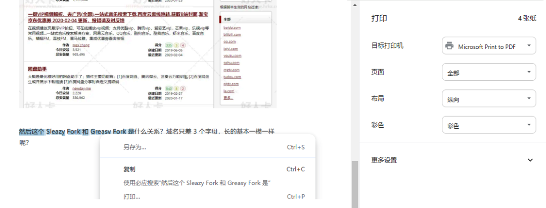 注意,有些网站修改了 Ctrl + P 快捷键,按了后不会激活打印模式,为的就是不让你保存(没错,就是某数字公司的网站)。