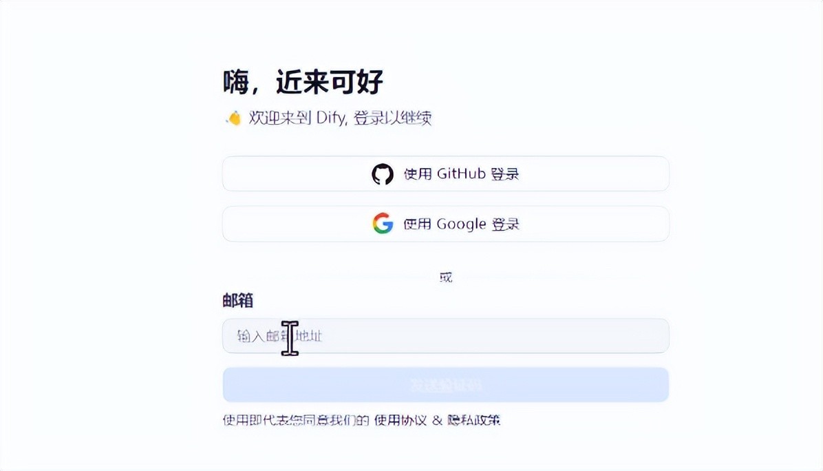访问 Dify 官网「https://dify.ai」,点击右上角『开始使用』按钮。支持三种注册方式: