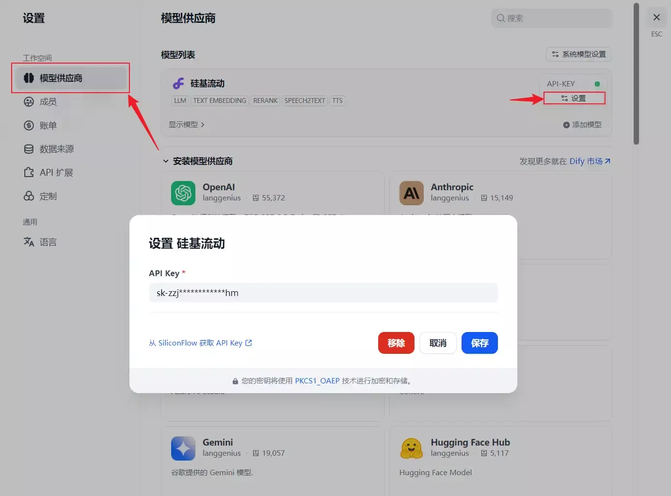 API 配置提示:从硅基流动等平台获取 API Key 后,需在 Dify 中粘贴保存。系统会验证 Key 的有效性,绿色标识表示配置成功。