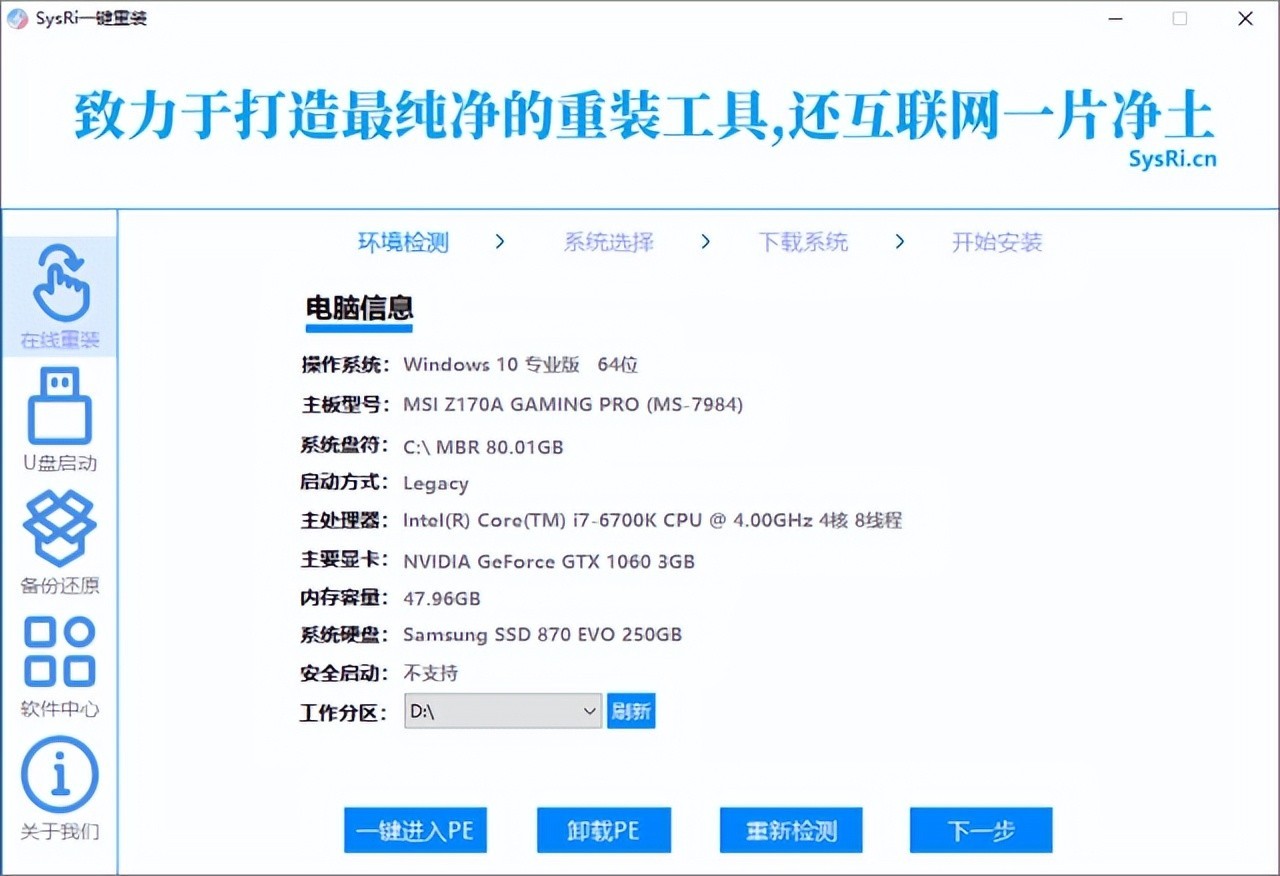 SysRi一键重装是一个纯净、强大、易用的系统重装工具。