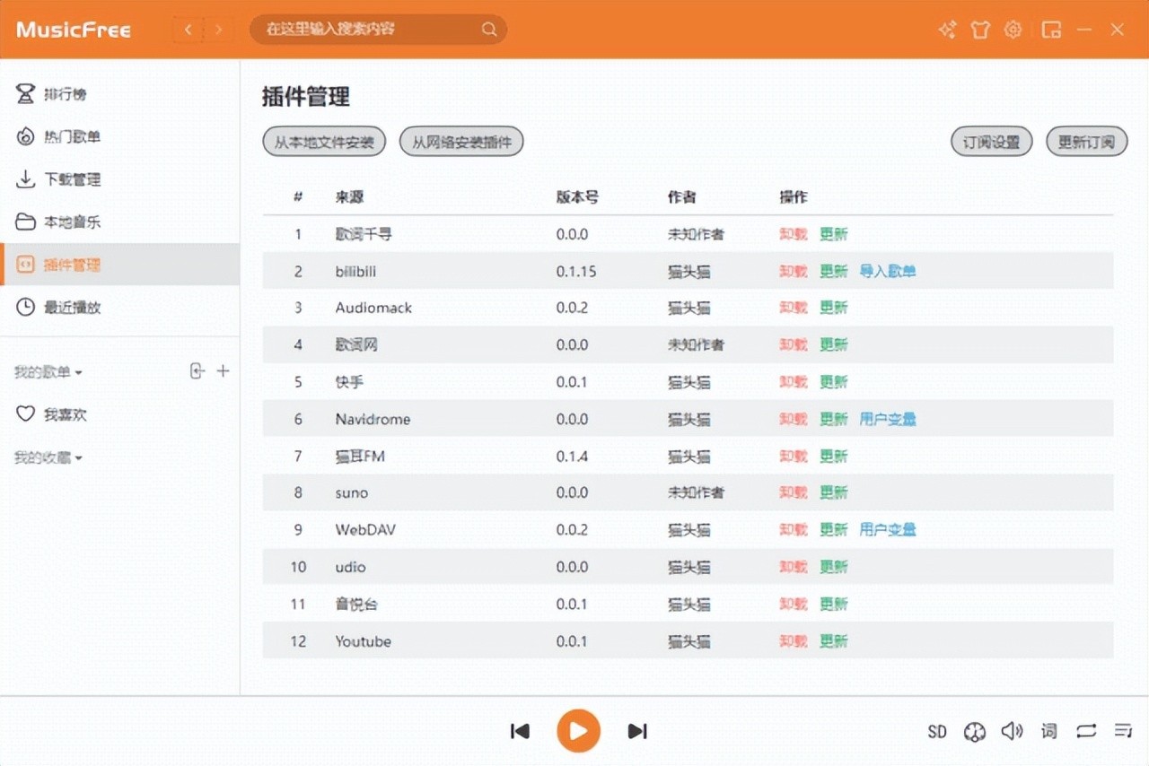 插件支持的功能:搜索(音乐、专辑、作者、歌单)、播放、查看专辑、查看作者详细信息、导入单曲、导入歌单、获取歌词等。