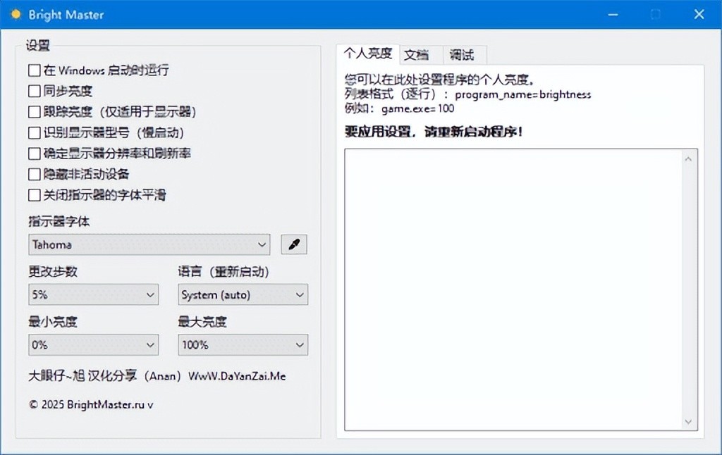 Bright Master 汉化绿色版是一款专为需要调整显示屏幕亮度的用户设计的实用工具。无论是在昏暗的环境中工作,还是在阳光直射的室外使用笔记本电脑,适当的屏幕亮度设置都能显著提高视觉舒适度和工作效率。该软件功能简单但实用,通过清晰的界面,用户可以一键调节屏幕亮度至适宜的水平,避免了眼睛因强光或过暗环境而产生的疲劳。这对于长时间面对电脑屏幕的用户来说,帮助显著,能够有效提升工作和娱乐的体验。