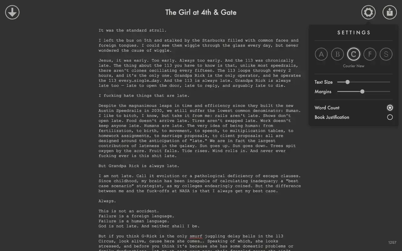 Flowstatec 是 Mac 平台上一款优秀的写作软件,当你开始使用 flowstate for Mac 写作时,只有不停的输入内容才能保证你的内容不会消失,一旦退出或者停止输入,flowstate for Mac 将不会保存你写作的所有内容,非常有趣的软件。它是一款专门用于帮助用户保持专注的文本编辑器。当你使用 Flowstate 编辑文字时,你需要将光标保持在编辑器中,并在编辑的同时保持专注,否则未完成的句子就会在一定时间后消失。这种时间可以根据你的需求进行调整,比如 5 秒、10 秒或更长的时间,你可以根据自己的需要进行设定。Flowstate 还提供了一些主题,以便你可以自定义编辑器的外观,让它看起来更适合你的口味和风格。同时,Flowstate 还提供了一个日历视图,用于记录你的工作进度,以及一个预设模式,以便你可以快速启动你需要的编辑模式。
