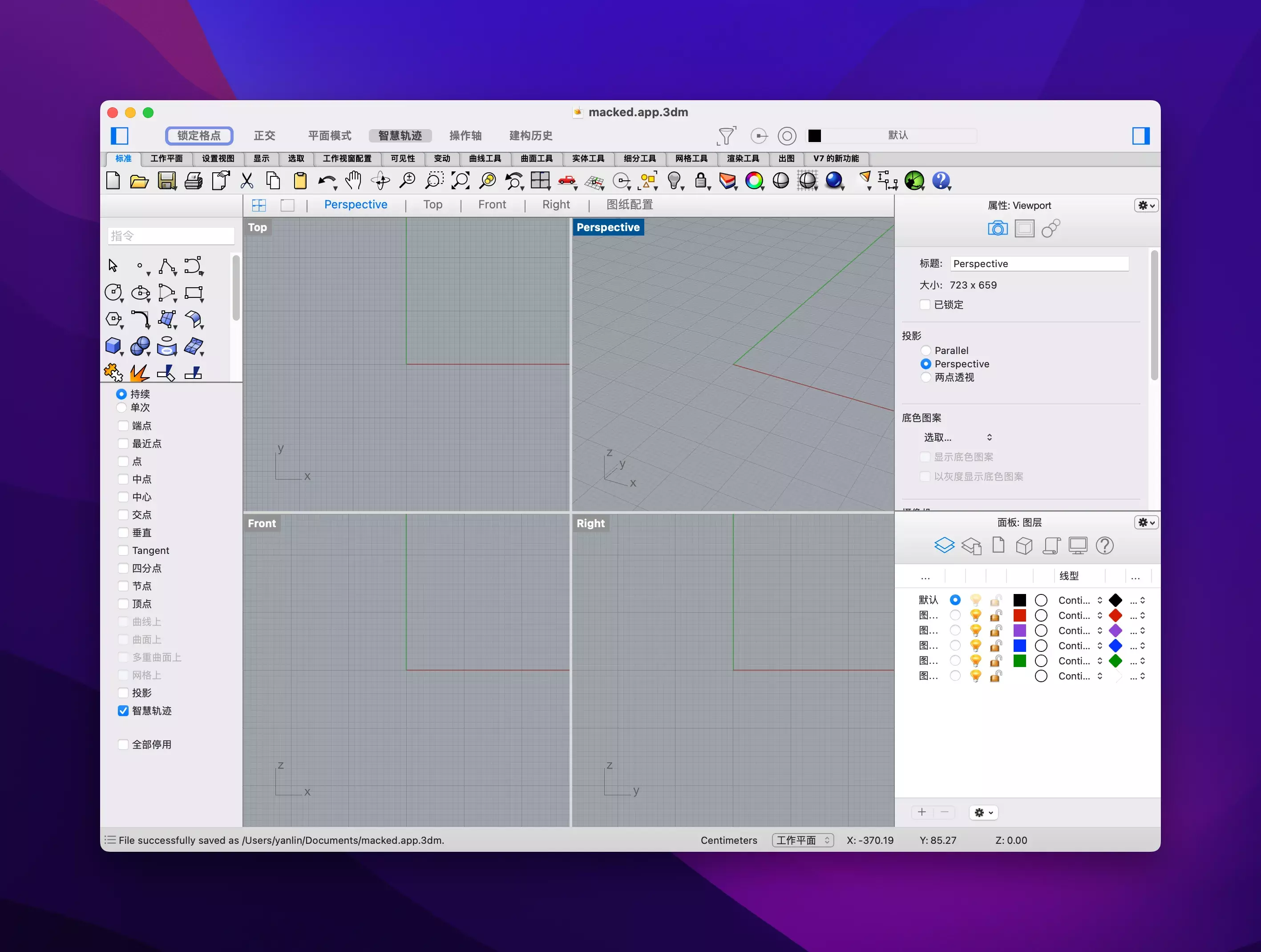 Rhino可以用于2D和3D建模,用户可以使用多种建模工具创建几何图形、曲面和立体模型。