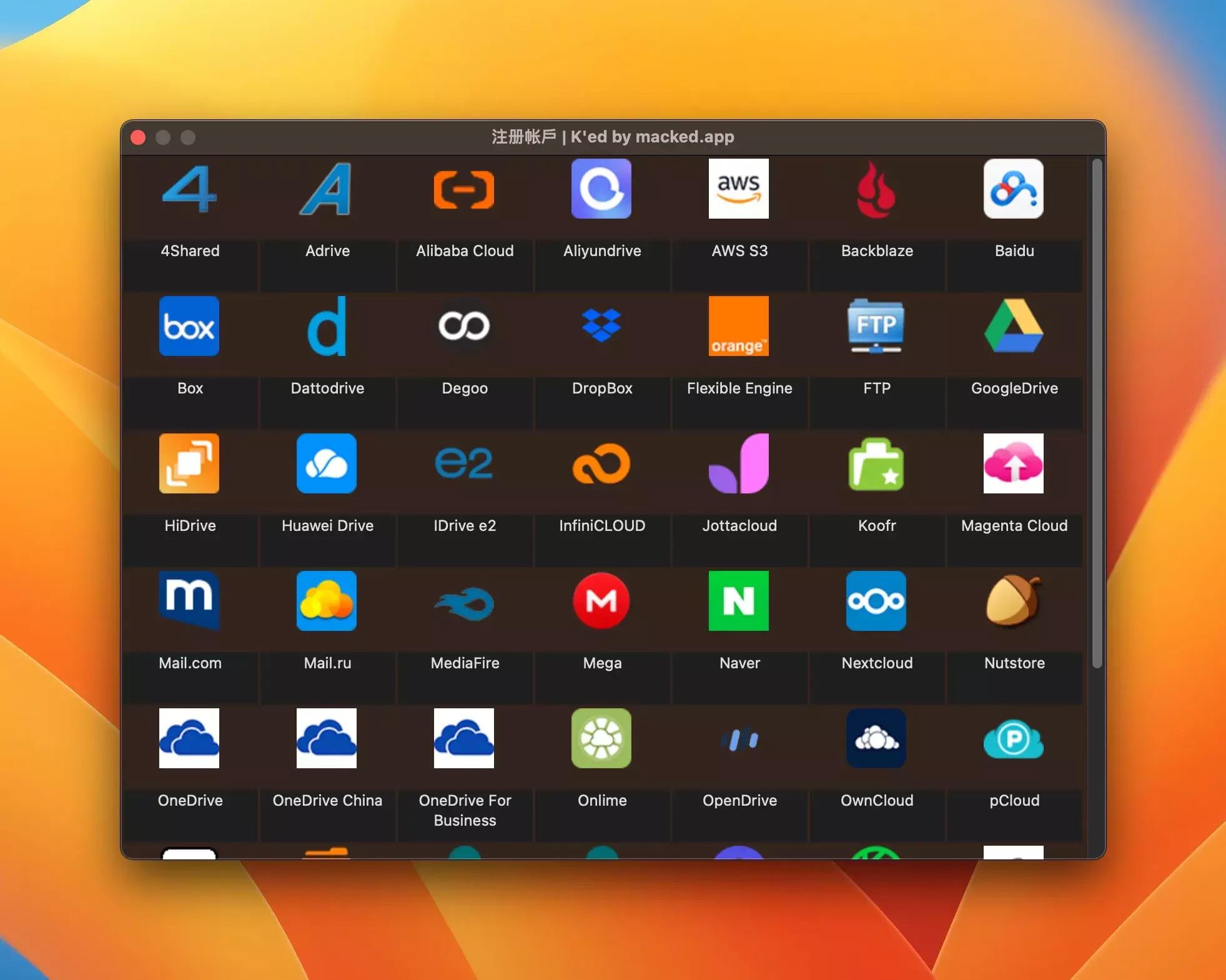 OneDrive, OneDrive for Business, OneDrive for China, Google Drive, 4shared, Box, Mediafire, Yandex, Baidu, Naver, Dropbox, Hidrive, pCloud, Mail.ru, Mega, WebDAV, Mail.com, Adrive, Magenta Cloud, Stack Storage, Datto Drive, SharePoint Online, SharePoint China, S3, AWS S3, Wasabi, Opendrive, Koofr, Backblaze, Owncloud, Nextcloud, Infinicloud, Jottacloud, Huawei, Orange Flexible Engine, Onlime.dk, Nutstore, Degoo, Alibaba Cloud, Aliyundrive, Idrive e2, FTP 以及 SFTP.