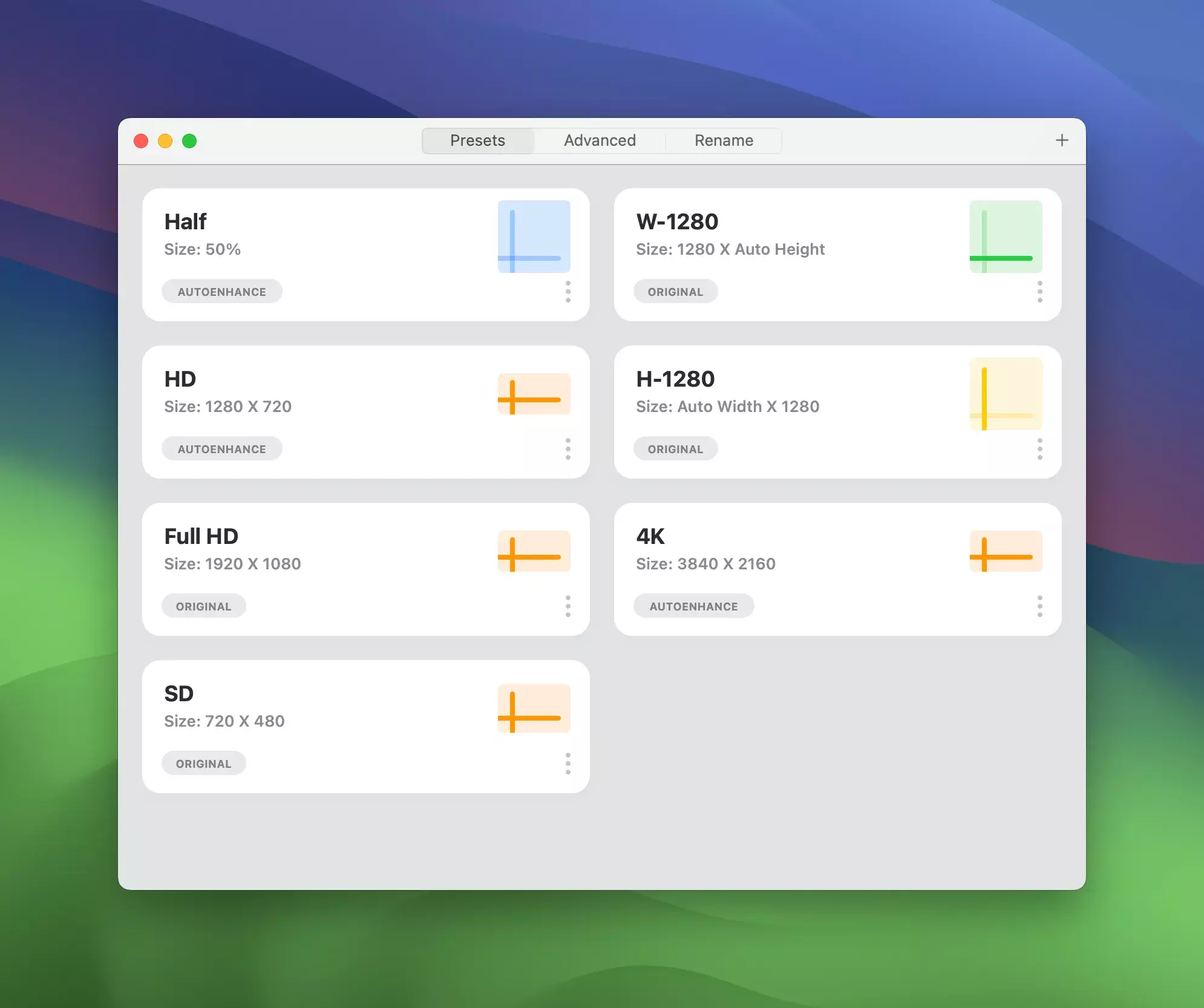 在RePix PRO中,调整大小毫不费力。从一大堆大小预设中调整大小。 只需将你的图像拖放到任意你想要的预设上。就这么简单。你完成了。 对尺寸不确定吗? 没问题,RePix PRO现在让你按照你想要的大小百分比进行调整。