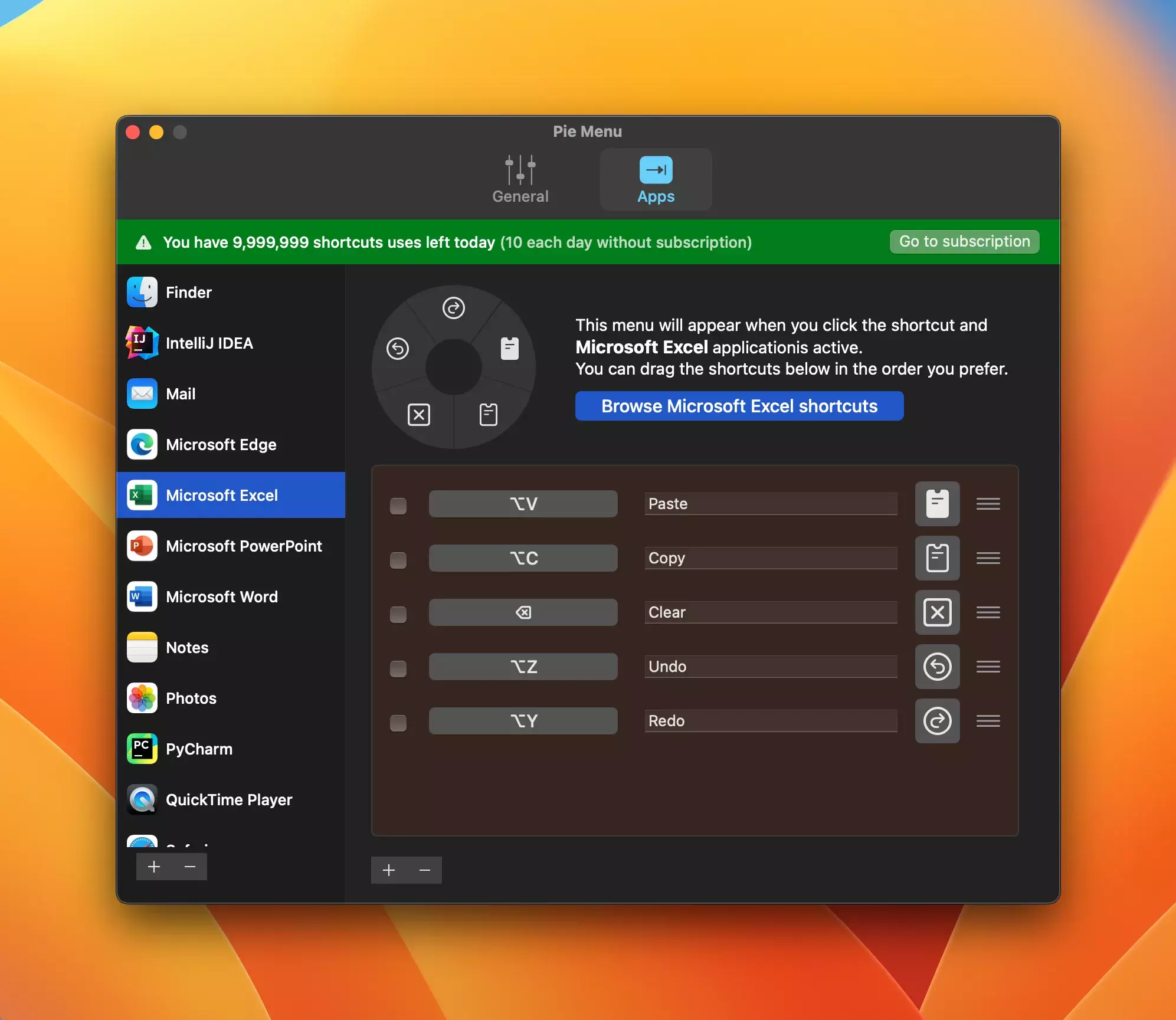 想象一下,不再需要记住每个应用程序的多个快捷方式。Pie Menu 通过只要求您记住一个快捷方式来简化一切。而且最好的部分是什么?该应用程序根据活动的应用程序打开不同的圆形菜单,确保快速访问所需的操作。