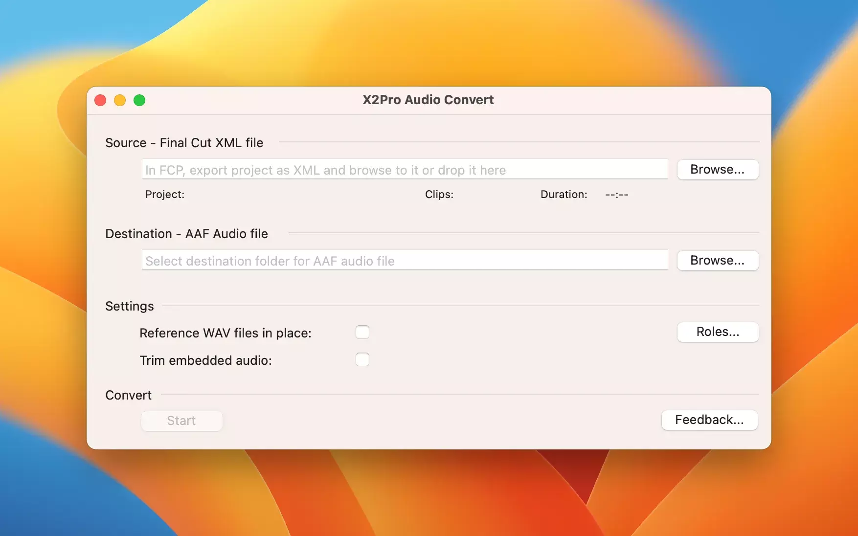 将您的 Final Cut Pro X 项目简单快速地转移到音频套件。X2Pro Audio Convert 可以将您的 FCP X XML 转换为带有嵌入式或引用音频媒体的 AAF 文件,Avid Pro Tools 可以将其作为会话打开,实现两个应用程序之间的无缝集成。
