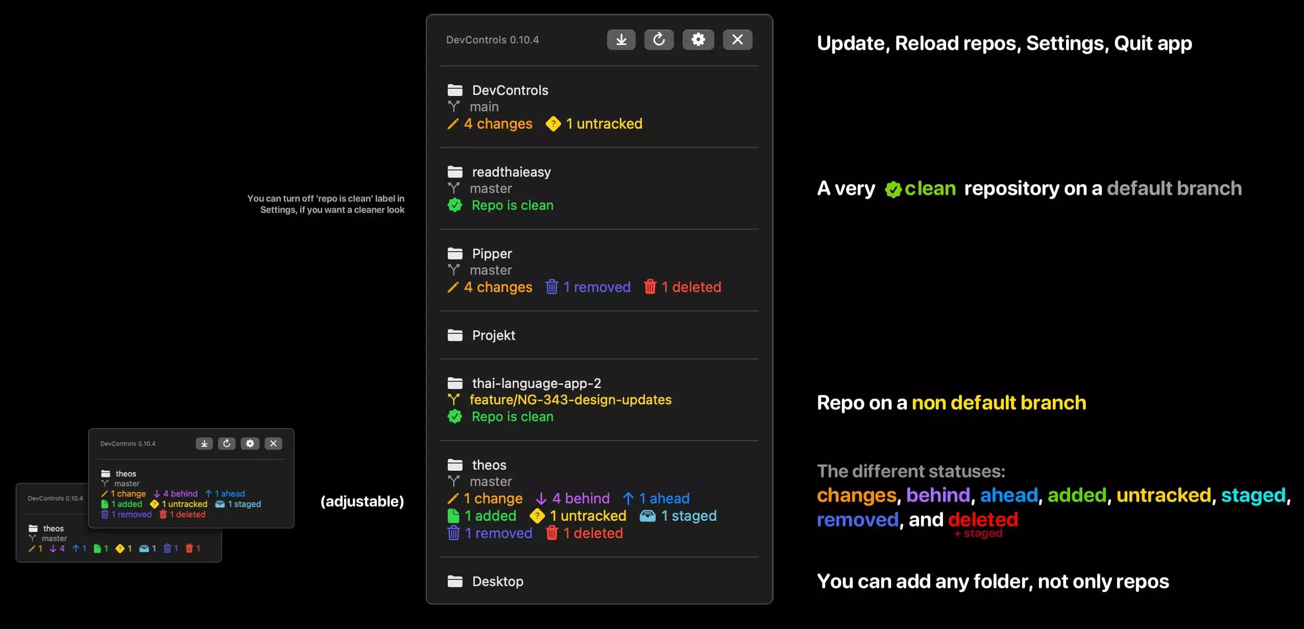 DevControls是一款专为开发者设计的菜单栏应用,旨在提供一种便捷的方式来管理和快速访问最常用的仓库、文件夹和网址。用户可以将喜爱的仓库等添加进这个始终可见的菜单中,无论何时都能轻松访问,极大地提升了工作效率和项目管理的便利性。该应用不仅支持更新、重新加载仓库和设置等基础操作,还提供了清晰的仓库状态显示,包括更改、落后、领先、新增、未跟踪、已暂存、已删除等各种状态。除了仓库,用户还可以添加任意文件夹或自定义网站链接到每个个别的仓库中,方便快速定位项目文件和执行快速动作,如Git操作等。DevControls以其整洁的界面和强大的功能,成为开发者日常工作中不可或缺的工具。