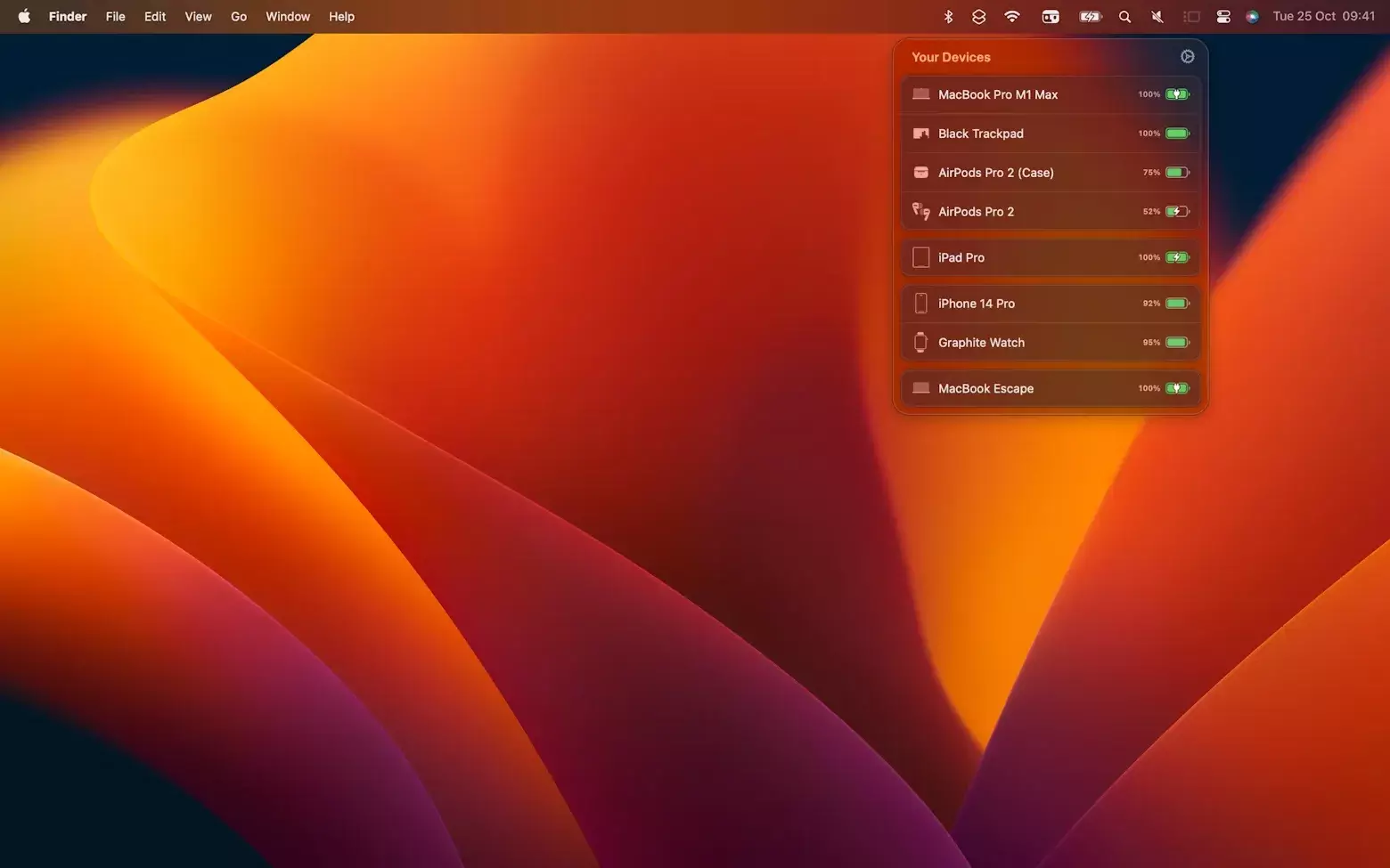 在菜单栏的图标上简单点击,就会显示出连接到你的Mac的无线设备列表以及它们的电池状态。一眼就能看到你的无线设备的充电状态。你也可以访问附近并安装了AirBuddy的其他Mac的外设信息。