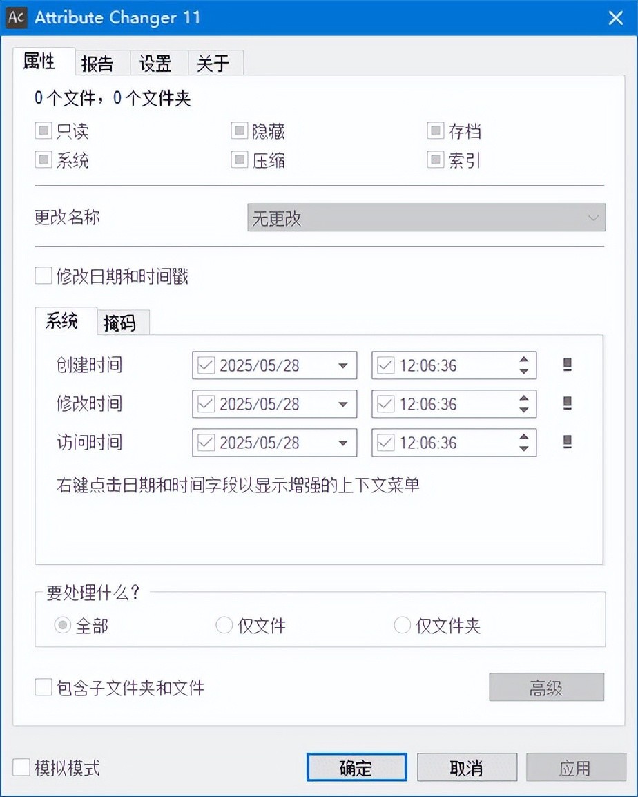 递归操作支持:对选定目录下的所有子文件夹及文件进行属性修改,实现批量处理。