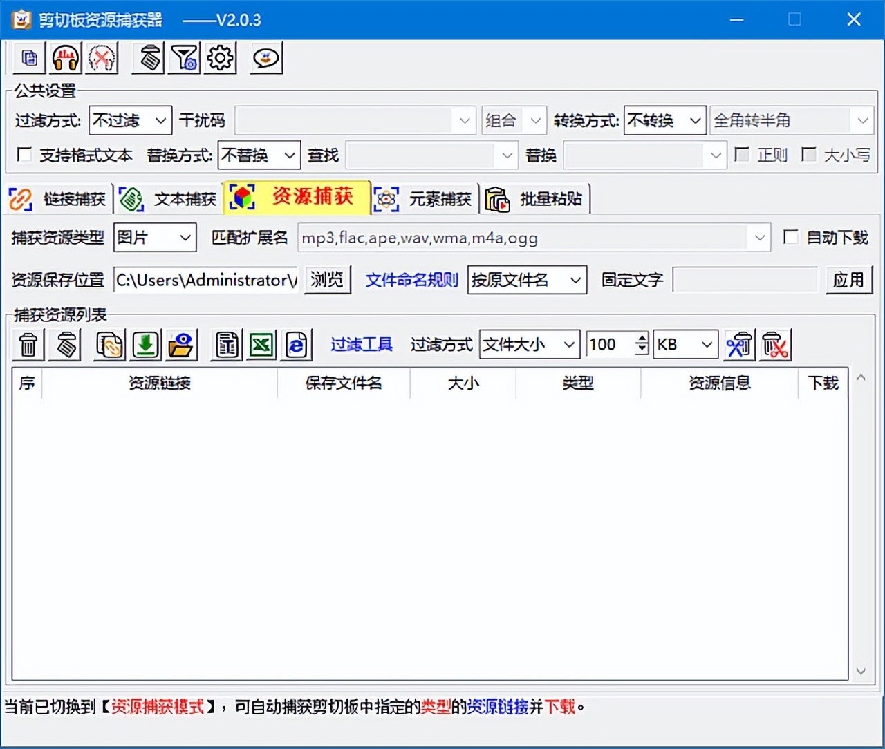 软件提供链接捕获和文本捕获两种模式,可能过简单的规则设定从剪切板内容中过滤筛选想要的资源;