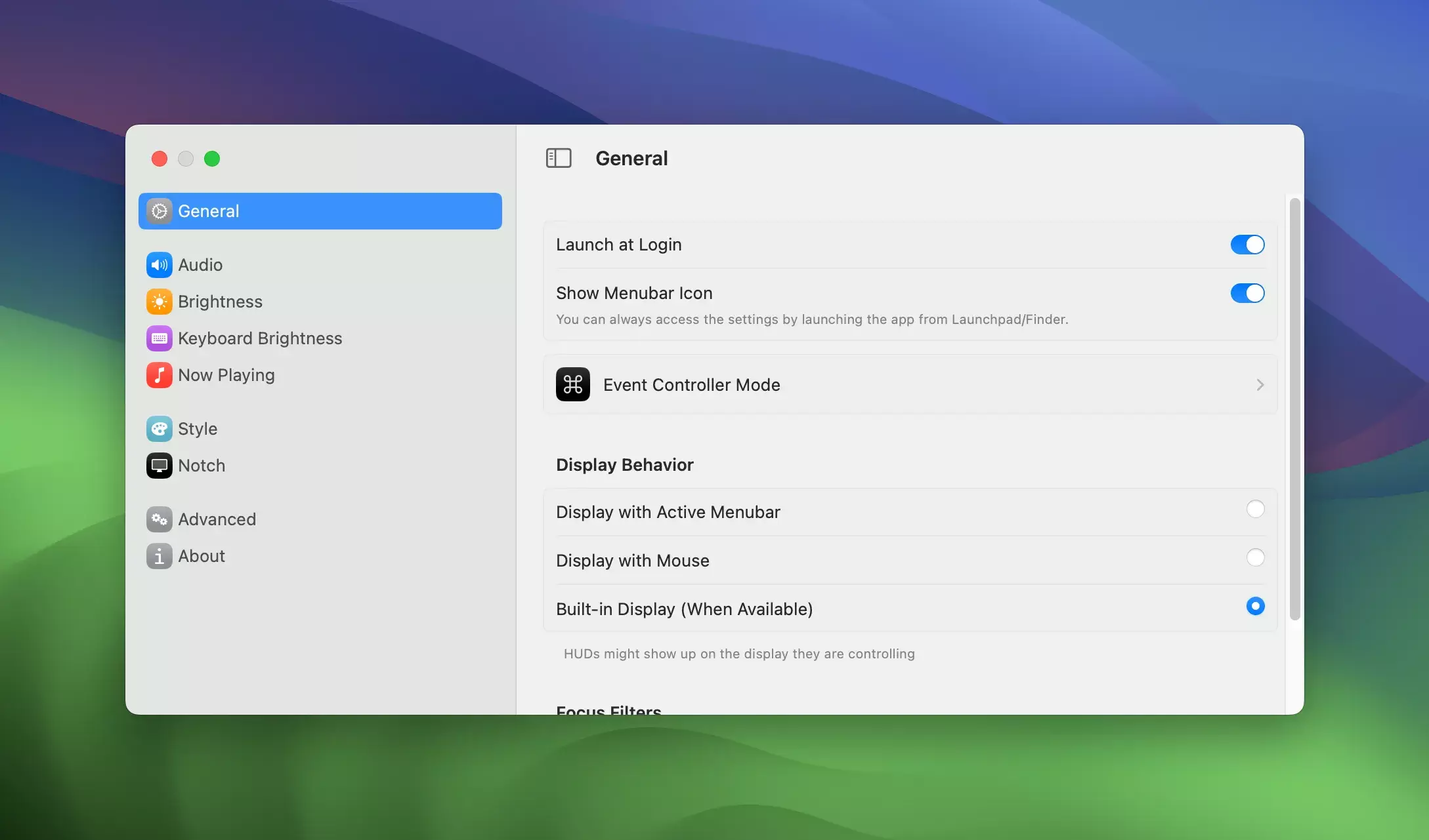 - 快捷方式和焦点过滤器: 允许通过快捷方式控制键盘亮度,并在启用焦点模式时隐藏HUD,保持桌面整洁。