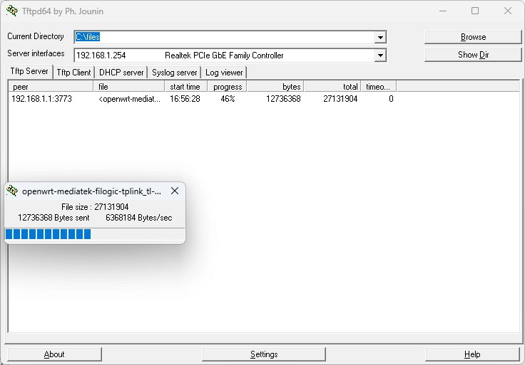 - 执行以下命令将固件传输到 Windows ,之后点击打开的 tftp 服务器,看到有文件在传输,等待传输完成tftp -p -l /tmp/backup.img -r backup.img 192.168.1.254