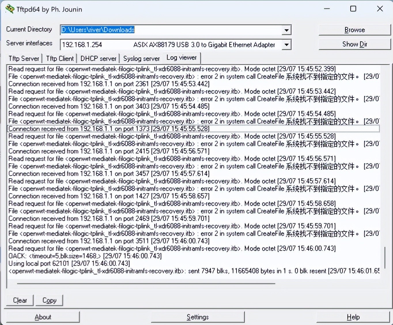 在 uboot 写入完成后,请直接断电,在接上电源启动,然后观察 tftp 服务器,如果 files 下面的 xxx-recovery.itb 文件名刚好为 openwrt-mediatek-filogic-tplink_tl-xdr6088-initramfs-recovery.itb 那么你会看到文件传输的动作,如下图: